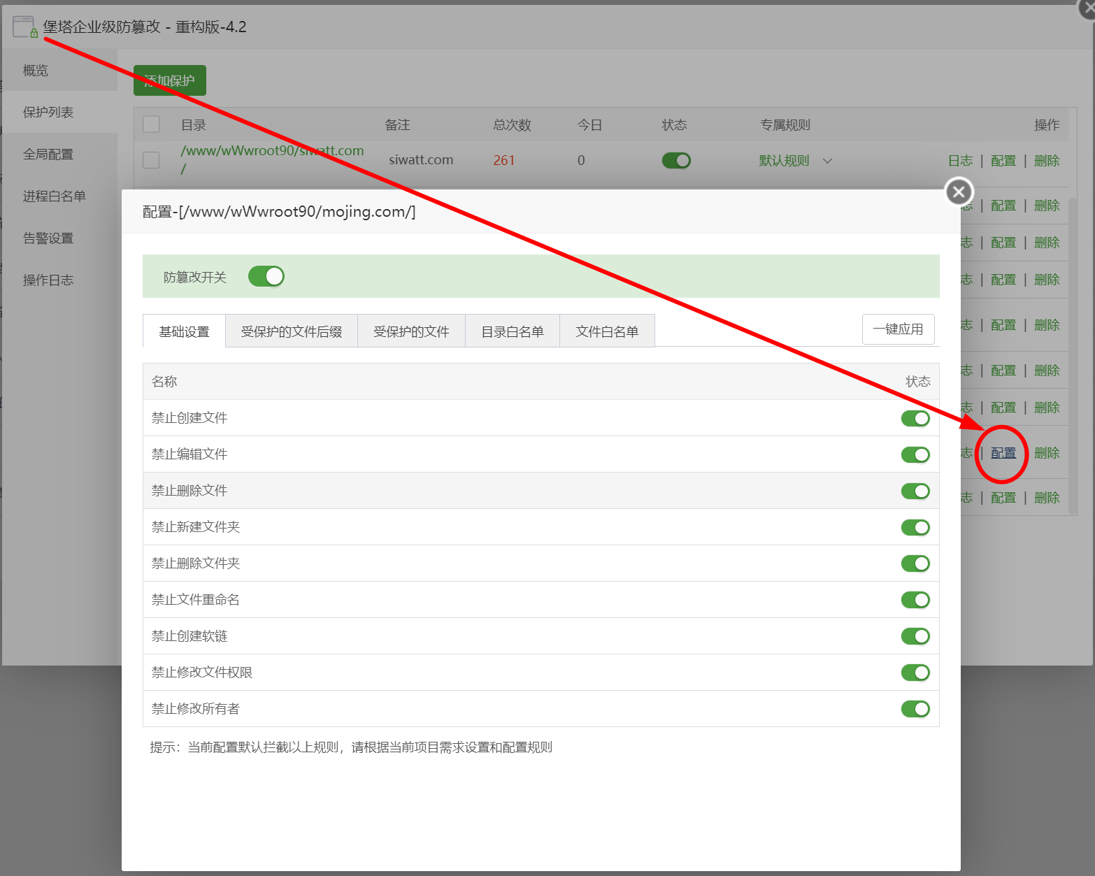 网站防篡改-重构版,也是差不多,在对应网站的右侧【配置】,点击【排除目录】,也是把data/这个加进去。